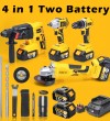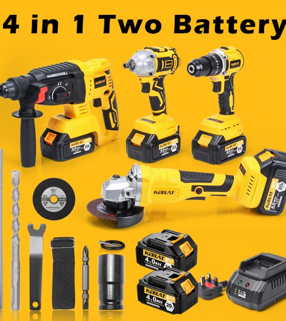 KEELAT四合一无刷无绳冲击扳手冲击钻旋转锤钻角磨机同电池一箱工具套装,带20V 4.0Ah锂离子电池
